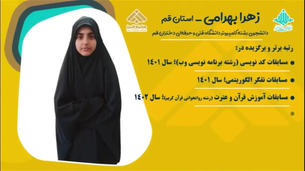 افتخاری دیگر از خانم زهرا بهرامی هنرجوی رشته شبکه و نرم افزار رایانه هنرستان نمونه دولتی حضرت زهرا(س) با مدیریت سرکار خانم علیمحمدی کسب رتبه برتر کشوری و برگزیده در جشنواره البرز سال 1402